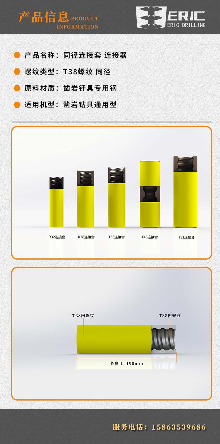 产品展示, 连接套, 顶锤钻具 10-30-21 T38连接套-同径连接套 产品名称:T38连接套螺纹类型:T38内螺纹规格型号:D55外圆-T38内螺纹产品长度:总长190mm适用机型:台车掘进通用型原料材质:凿岩钎具用钢23CrNi3Mo(上海宝钢) T38螺纹同径连接套 连接套