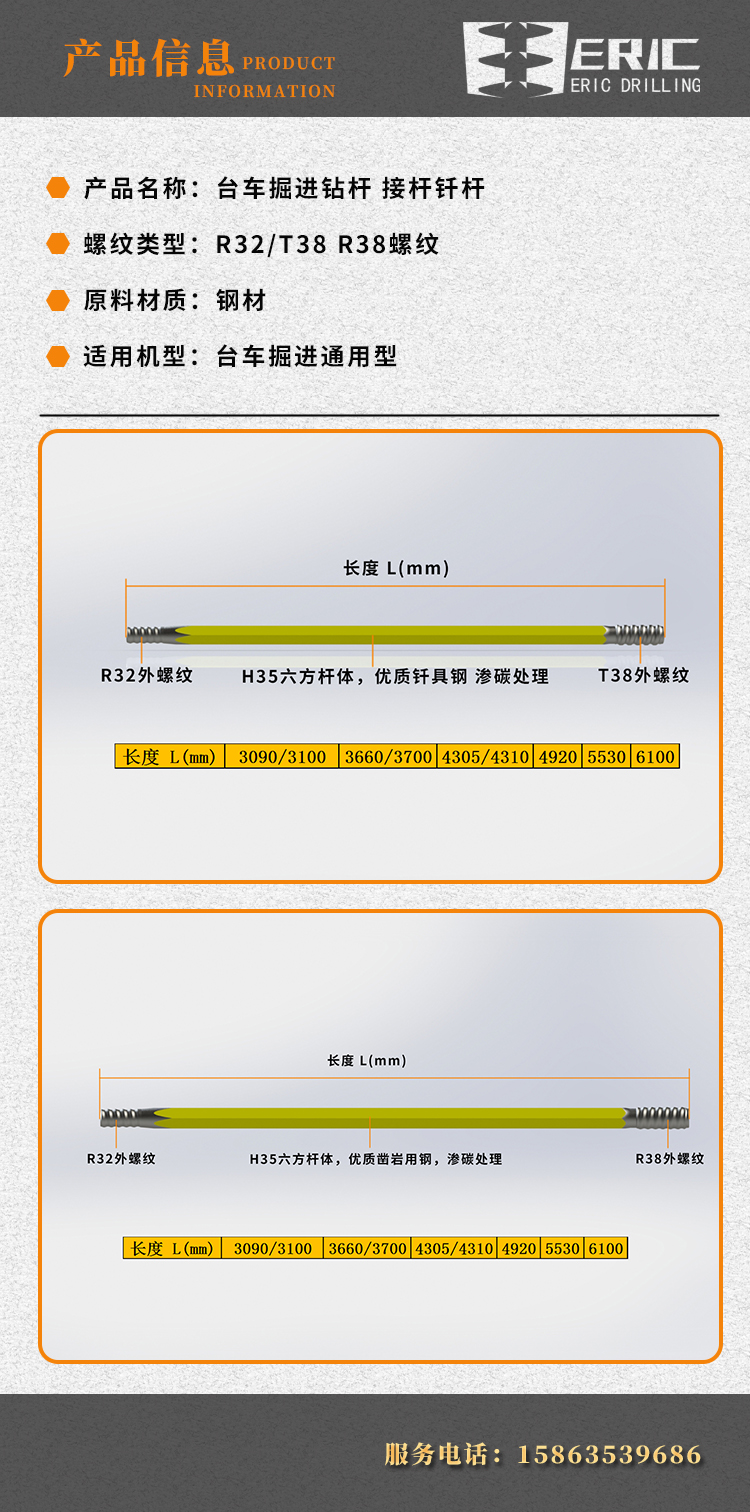 产品展示, 钻杆, 顶锤钻具 10-20-21 台车钻杆-连接钎杆 产品名称:连接钎杆 螺纹类型:R32-T38/R38 规格型号:H35 适用机型:台车掘进通用型 原料材质:凿岩钎具用钢(上海宝钢) 钻杆